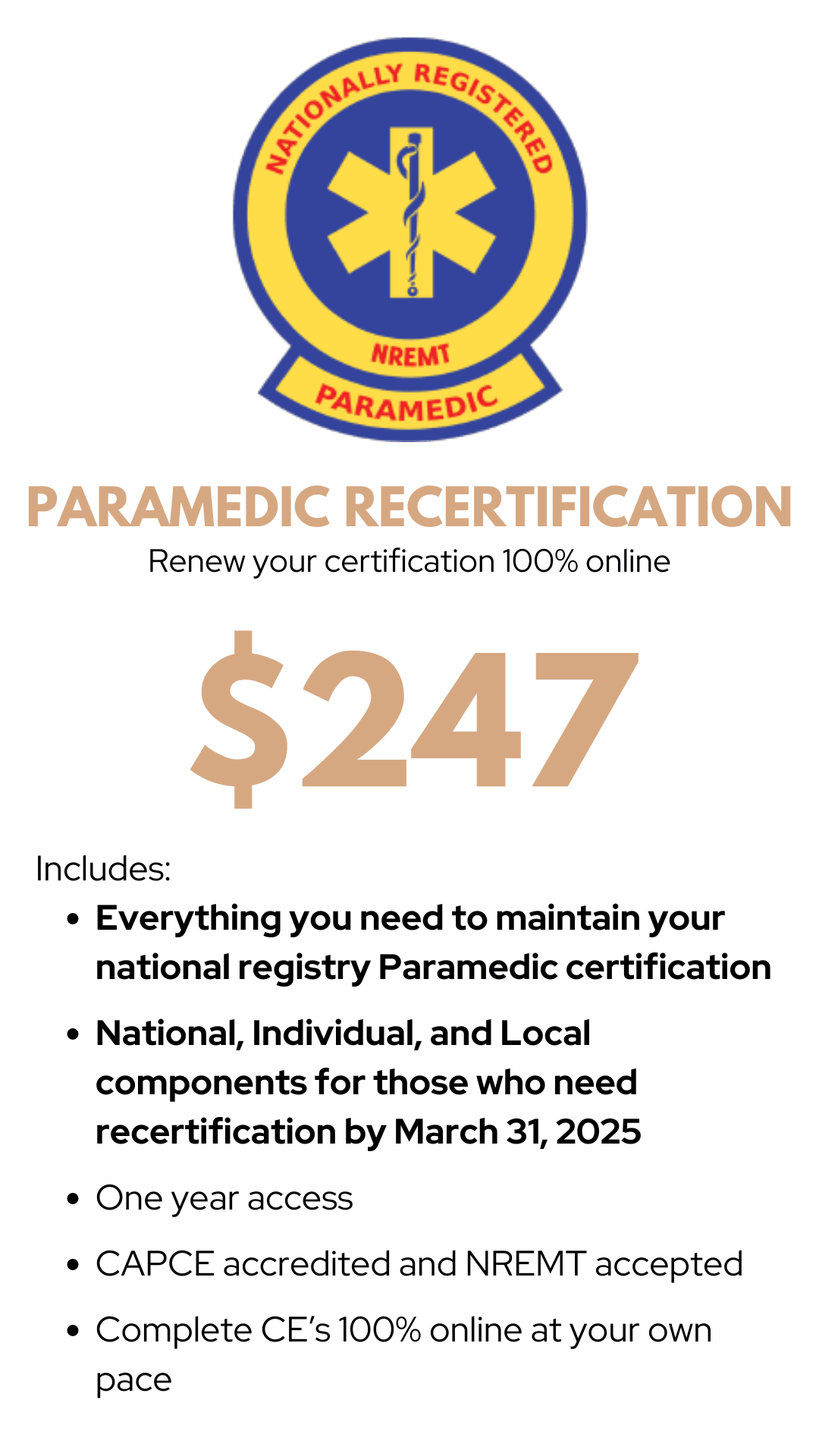 No need for a full recertification? No problem! You can complete your remaining national component hours entirely online with The Paramedic Coach.